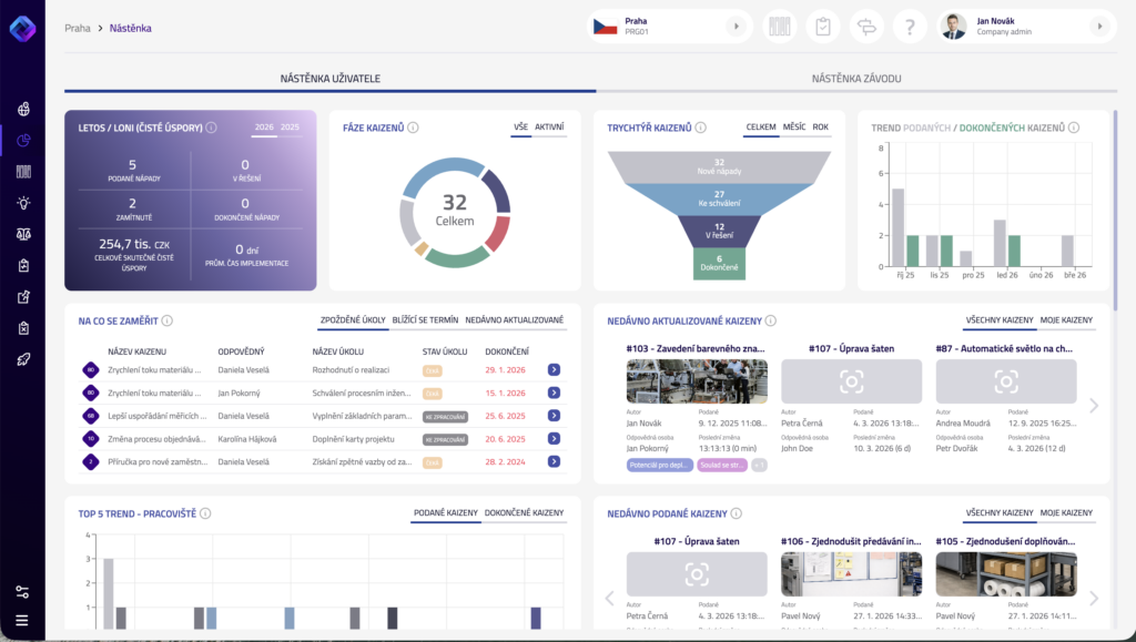 Lean zlepšování má smysl tehdy, když je vidět jeho dopad. eKaizen umožňuje sledovat přínosy jednotlivých aktivit i vývoj klíčových metrik procesů. Přehledné nástěnky a reporty ukazují například: