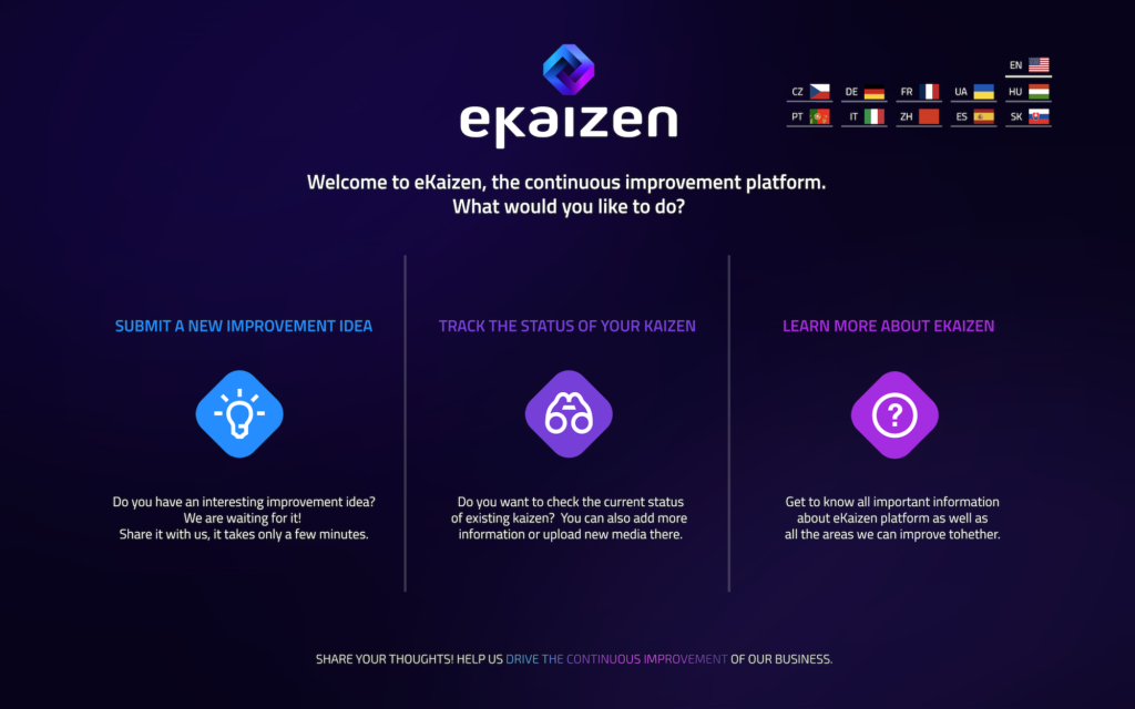White label all public interfaces and ensure a smooth adoption of the platform. Show everyone that eKaizen is YOUR tool and you are all using it together to improve your company. eKaizen also comes with a set of posters and stickers with QR codes for easy submission. These can have your brand as well and are a great way to increase awareness of the platform (and CI in general). Encourage everyone to be a part of CI in your organization!